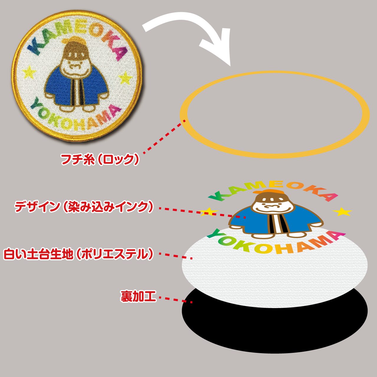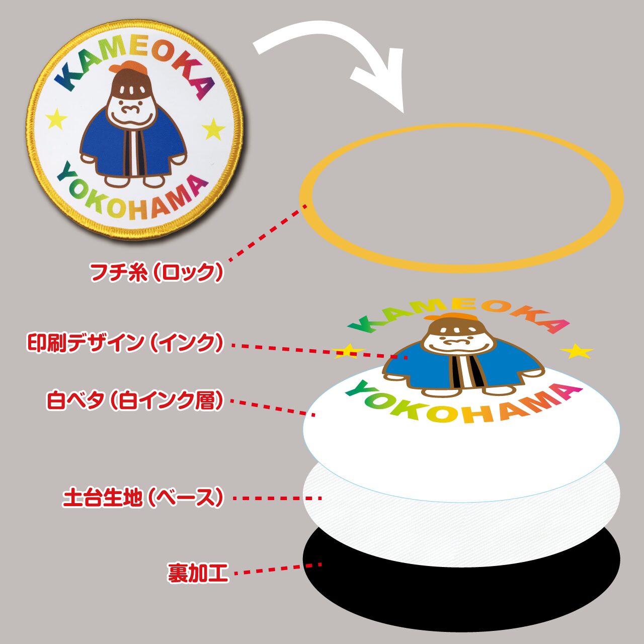 転写ワッペンは、まず土台生地の上に白ベタ(白インク層)をひき、その上にデザインをフルカラーで印刷する構造です。