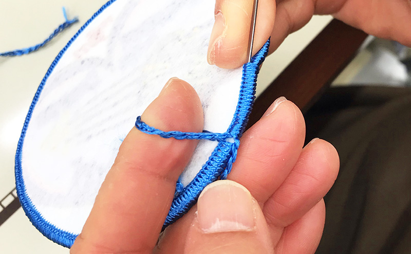ロック糸の終わりを丁寧に処理し、見た目をきれいに整えます。この最終工程を丁寧に行うことで、長く使える高品質なワッペンに仕上がります。