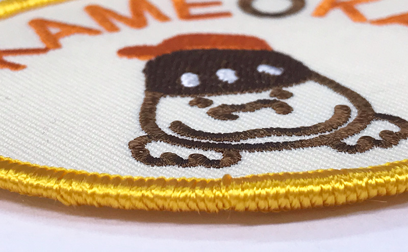 ワッペンの縁取り方法のひとつが「ロック加工」です。側面を糸でしっかり包み込むため、厚みがあり存在感のある仕上がりになります。一般的に知られている方法ですが、専用設備を自社で保有し対応できる会社は限られており、カメオカの強みのひとつです。