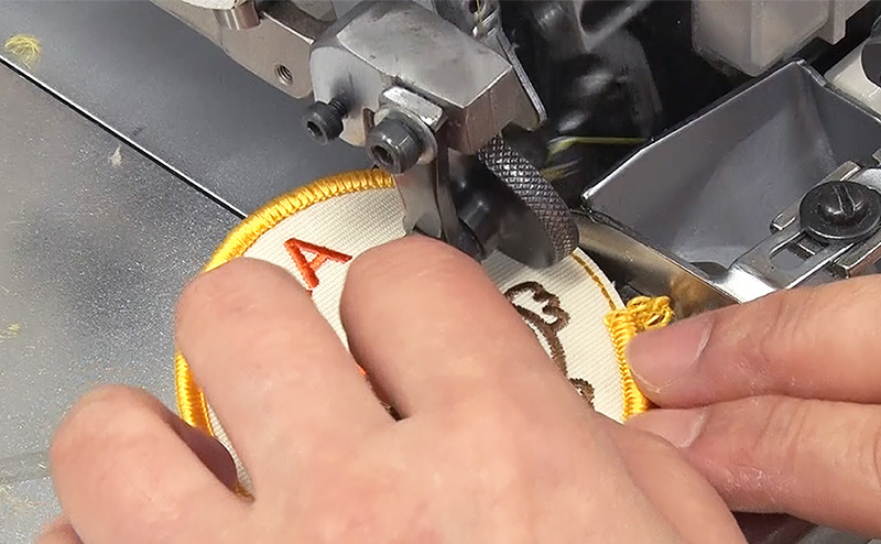 専用のロックミシンで、ワッペンの縁をぐるりと糸でかがります。この工程で、ワッペンの印象を決める「縁の仕上がり」が完成します。