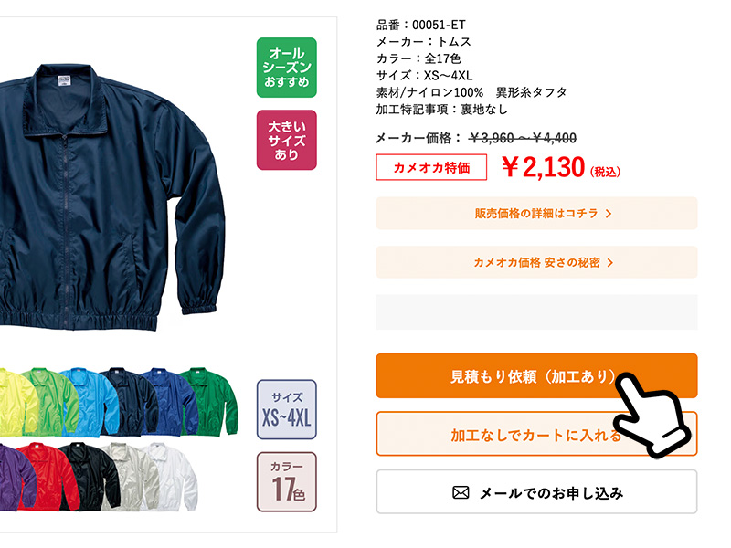 オリジナルウェア専門店カメオカにアクセスし、ご希望の商品ページへアクセスしてください。